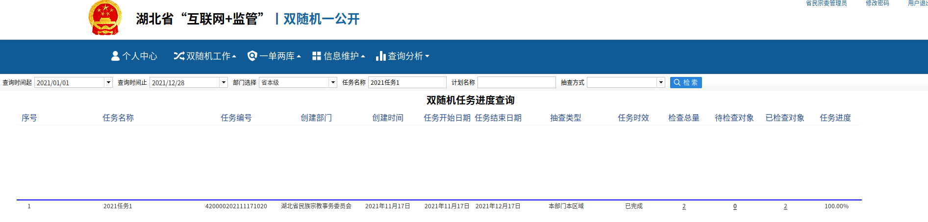 湖北省民宗委2021年“双随机、一公开”结果