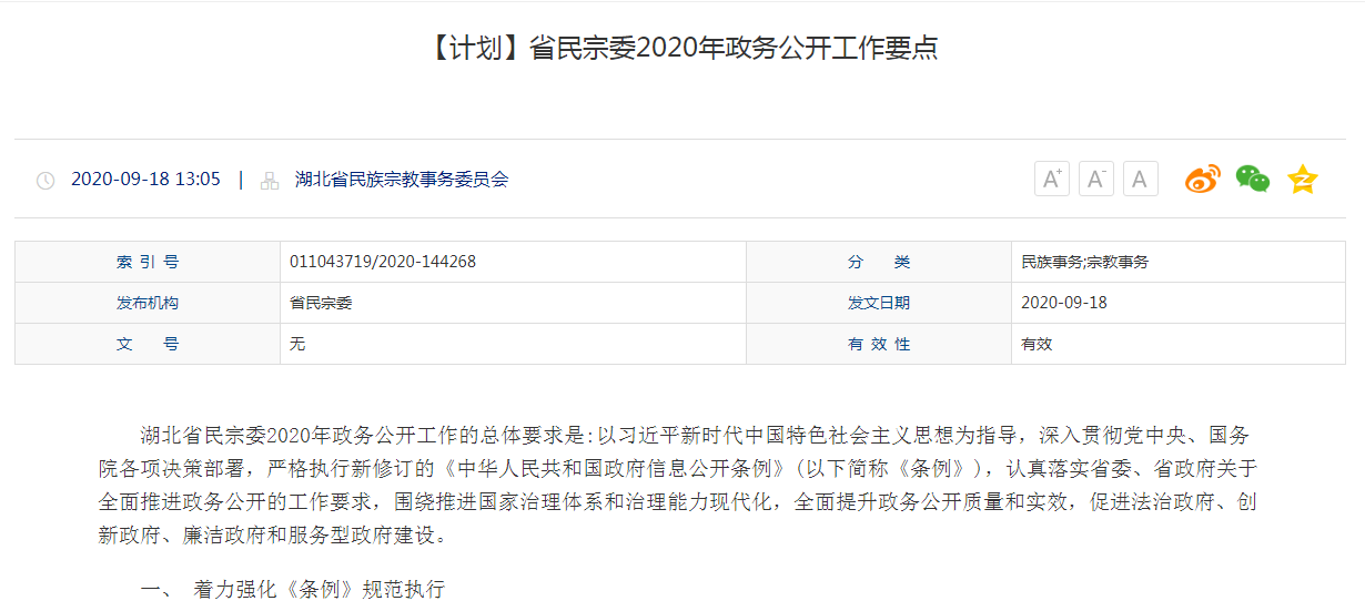 (二)规范政府信息管理。细化落实《条例》有关要求,修订完善了《信息公开指南》《湖北省民宗委政务公开实施办法》《门户网站信息审核发布规定》,制定下发了《2020年度政务公开工作要点》等规定规范。