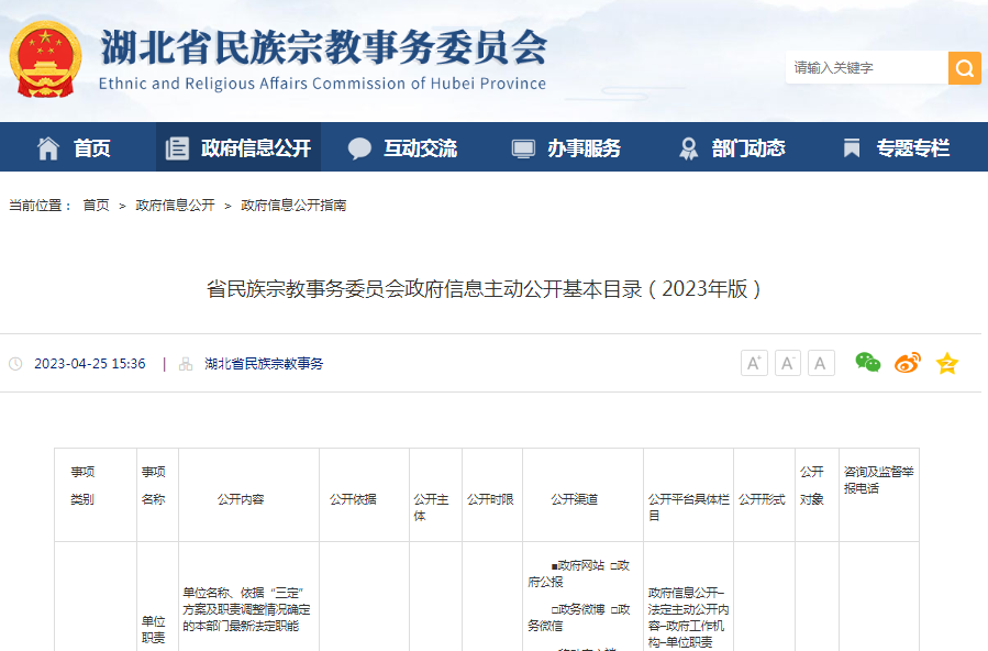 督促整改情况。对照本单位2023年度政务公开工作整改建议有关要求,逐条整改落实,均全部完成并书面反馈情况。按时公开本单位政府网站年度工作报表、政务公开工作年度报告,每季度公开门户网站和微信公众号内容自查情况。制定发布《betway首页信息公开指南(2023年版)》《省民族宗教事务委员会政府信息主动公开基本目录(2023年版)》,公布了公开内容、公开依据、公开主体、公开渠道、咨询电话等具体内容。
