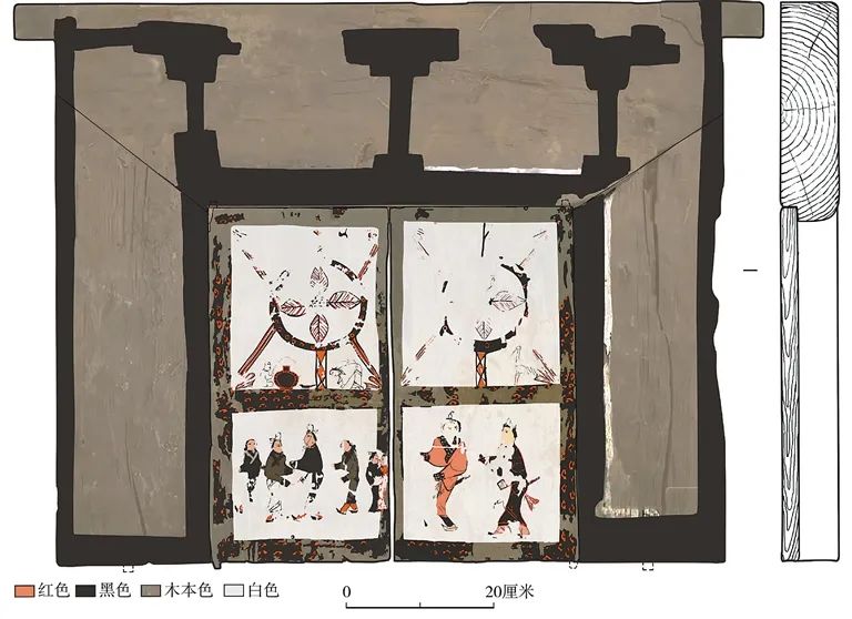 此外,从郑家湖M234墓头厢与棺室之间板门上的绘画,也可看到鲜明的秦文化标识。如作为祭器的扁壶图案和可能象征苍穹的树叶纹组合图案,扁壶是典型的秦文化器物,树叶纹则多见于秦都咸阳和秦东陵出土的瓦当。画中的仙鹤形象也很突出,这种仙鹤形象早在长沙子弹库楚帛画已出现,故板门上的仙鹤绘图应是受到楚文化的影响。